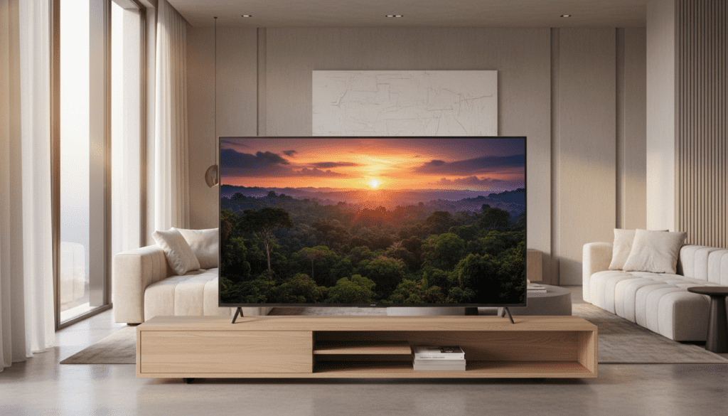 O acabamento metálico escovado nas bordas inferiores confere um toque de sofisticação que rivaliza com os modelos topo de linha da Samsung e LG. O suporte central (dependendo da polegada, o design do pé pode variar ligeiramente) é robusto, feito de metal pesado, garantindo estabilidade mesmo em racks mais estreitos, além de facilitar a alocação de uma soundbar logo abaixo da tela.